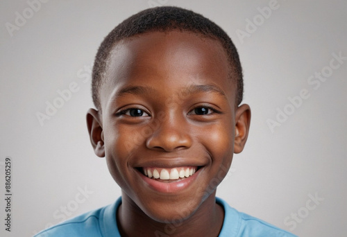 Portrait view of a regular happy smiling Benin boy, ultra realistic, candid, social media, avatar image, plain solid background