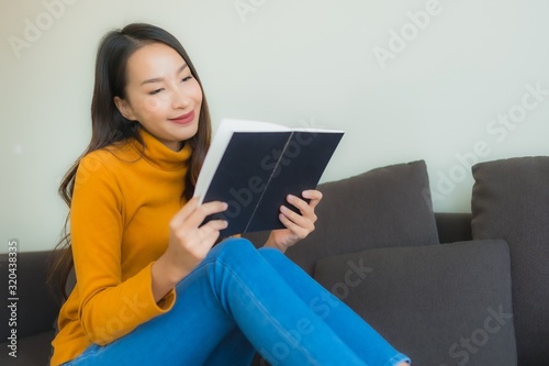 Portrait young asian woman read book on sofa chair with pillow in living room
