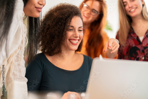 Positive female worker with crop multiracial colleagues in casual clothes gathered at table with laptop and smiling while looking at screen and working together in office