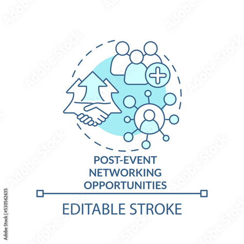 Post event networking opportunities turquoise concept icon. Planning small event abstract idea thin line illustration. Isolated outline drawing. Editable stroke. Arial, Myriad Pro-Bold fonts used