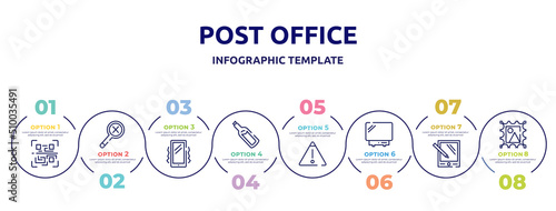 post office concept infographic design template. included qr scan, not found, vibration, message in a bottle, warning, , pda, post stamp icons and 8 option or steps.
