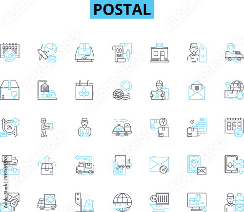 Postal linear icons set. Envelopes, Packages, Stamps, Mailboxes, Letters, Postmarks, Couriers line vector and concept signs. Delivery,Postcards,Express outline illustrations Generative AI
