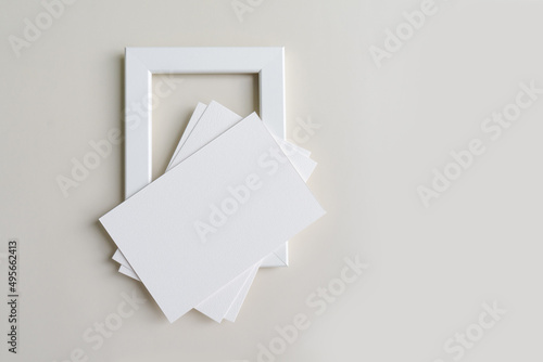 postcard template on a beige background. Paper on empty white frame for text layout.