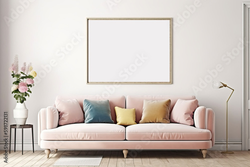 Poster mockup with frame on empty wall in living room interior with pink sofa and multi-colored pastel pillows. 3D rendering