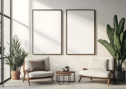 Poster mockup with two metal vertical frames on the wall in a scandinavian living room. 3D rendering.