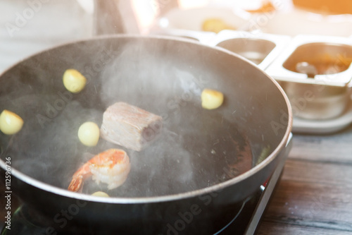 Potatoes and shrimp on pan. Steam coming from frying pan. Food ingredients for special dish. Fried prawn and tuna.