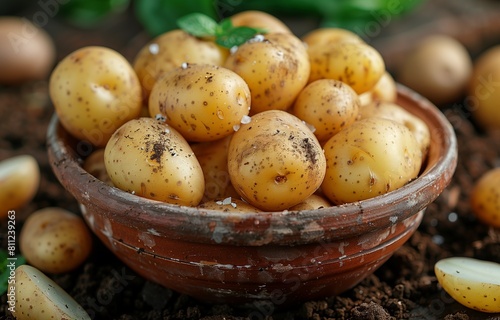 Potatoes arranged in a pot on brown surface, showcasing soil and sliced pieces