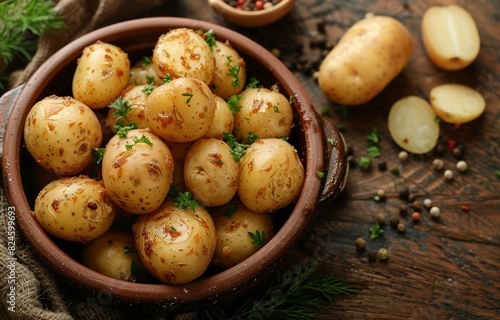 Potatoes arranged in a pot on brown surface, showcasing soil and sliced pieces