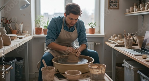 Pottery enthusiast crafting clay pottery in a studio, showcasing creativity and precision in ceramic art.