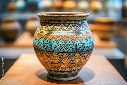 Pottery features vibrant hand-painted geometric patterns, highlighting ancient craftsmanship in a museum