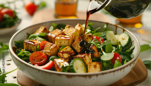 Pouring balsamic vinegar onto delicious salad with tofu and vegetables in bowl, closeup