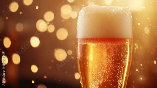 Pouring beer into a glass with a foamy head against a warm, glowing background, ideal for beer ads, pub menus, and beverage promotions.
