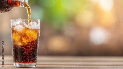 Pouring bubbly cola over ice in a refreshing glass under warm sunlight