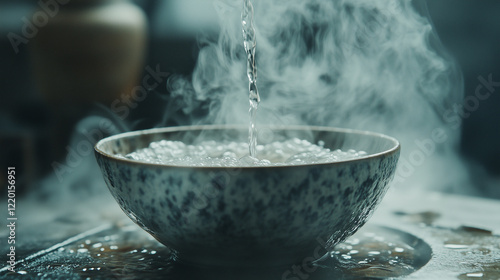 Pouring Hot Water into a Dark Grey Bowl, Steam Rising