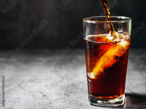 Pouring of Cola and Ice, Cola soft drink with ice cubes, soda fizzy drink in Cold glass