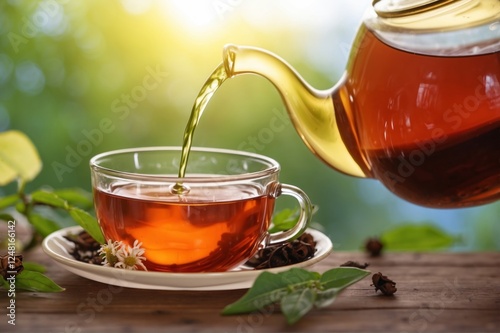 Pouring tea from a teapot into a cup on a blurred background of nature.