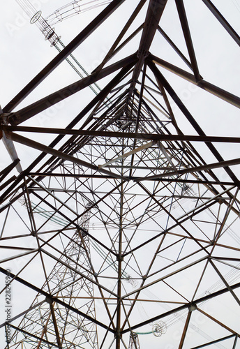 Power industry. Construct of a tall metal tower of high voltage electrical wires against the sky. Bottom up view