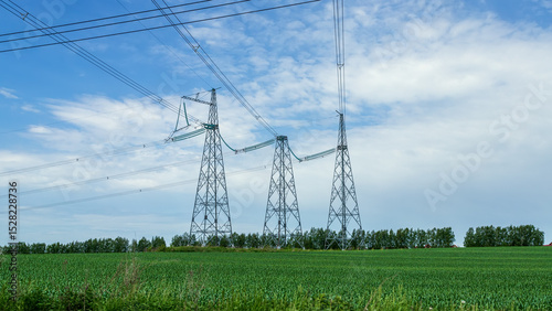 Power lines in a green field in the sunny summer day. Electrical substation.