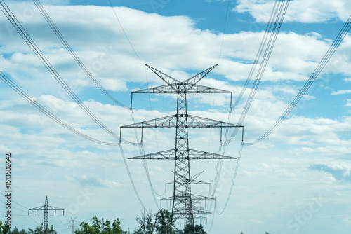 Power lines stretch across the landscape under a bright blue sky with scattered clouds in a rural area