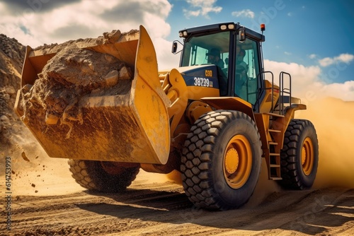 Power of a wheel loader in action at a quarry or construction site. Generative AI