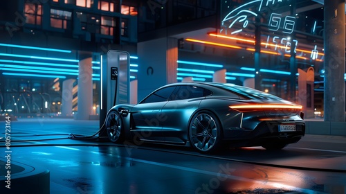 Power supply connect to electric car for add charge to the battery. Charging re technology industry transport which are the future of the Automobile.