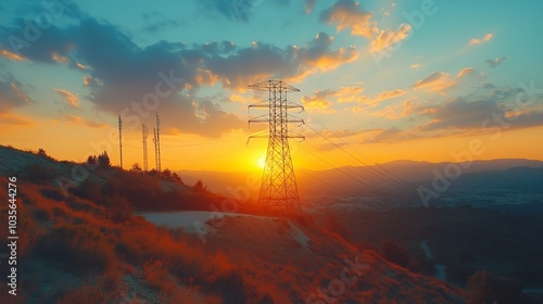 power transmission lines tower in the hill with sunset background