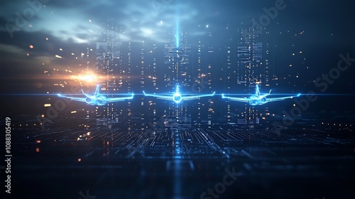 Powerful conceptual jet planes glowing in vibrant blue hues soaring in perfect sync through a dynamic digital landscape filled with radiant light beams and an ethereal atmosphere