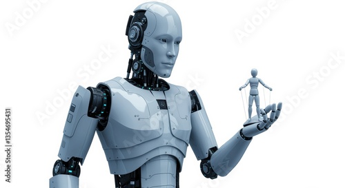 Powerful futuristic robot holding a small human figure in its hand, symbolizing control, protection, and the dominance of artificial intelligence