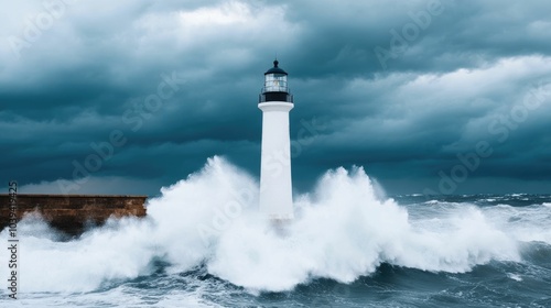 Powerful ocean waves crashing against a lighthouse during a dramatic storm showcasing the unstoppable force and energy of the turbulent seas and the resilience of the coastal structure