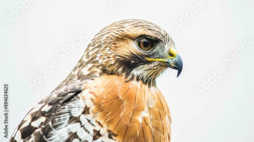 Powerful presence and impressive plumage of an intense red-shouldered hawk staring against a white background