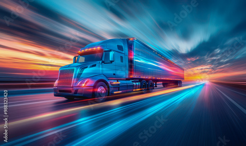 Powerful truck driving at dawn on an empty highway with green fields and a golden sky
