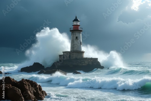 Powerful Waves Crashing Against Lighthouse in Stormy Seascape