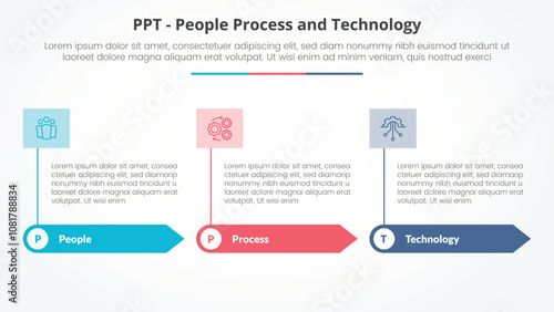 PPT framework infographic concept for slide presentation with rectangle arrow and banner on header top with 3 point list with flat style