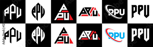 PPU letter logo design in six style. PPU polygon, circle, triangle, hexagon, flat and simple style with black and white color variation letter logo set in one artboard. PPU minimalist and classic logo