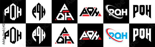 PQH letter logo design in six style. PQH polygon, circle, triangle, hexagon, flat and simple style with black and white color variation letter logo set in one artboard. PQH minimalist and classic logo