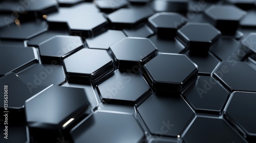 Precise geometric 3D hexagonal panels with ultra-polished chrome finish, seamless metallic surface with dynamic light reflections, deep space black to silver gradient, technological panel joints with