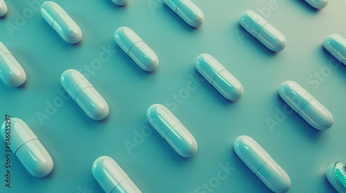 Precise Pill Placement Symmetrical Arrangement of Medication Capsules on Serene Blue Background