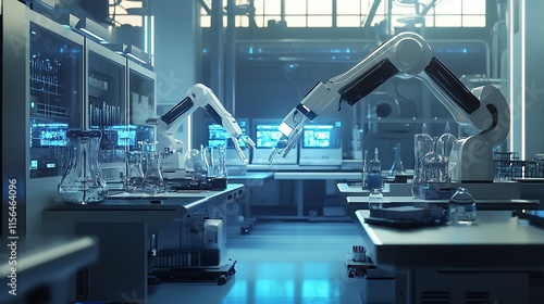 Precisely Working Robotic Arms in Futuristic Lab: 3D Render Illustration. AI Generated