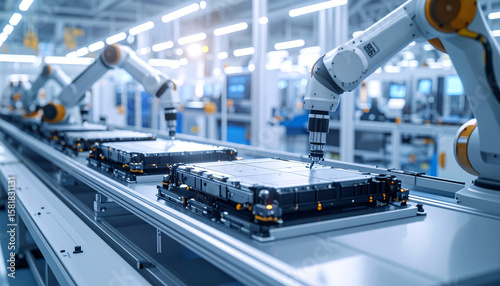 Precision and Progress: Robotic arms meticulously assemble components on a production line, symbolizing technological advancement, automation, and efficiency in modern industry.