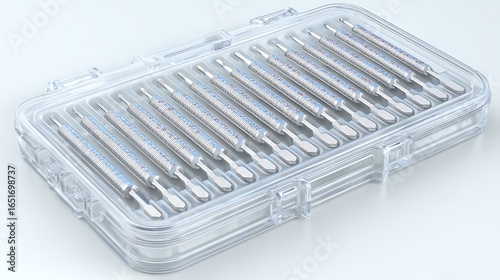 Precision Dental Instrument Set in Clear Case with Clinic Equipment, and Isolated on White.