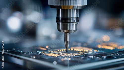Precision engineering at work a close-up of a machine tool carefully working on a complex circuit board with a focus on accuracy and detail.