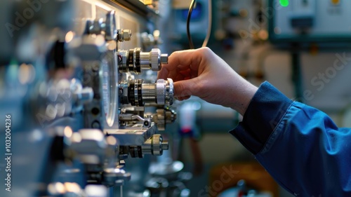 Precision engineering in action: hand adjusting industrial machine settings for quality control