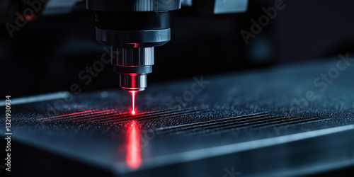 Precision in Motion: A close-up shot of a laser cutting machine at work, the red beam etching intricate patterns into a metal surface, showcasing technological advancement and industrial process.