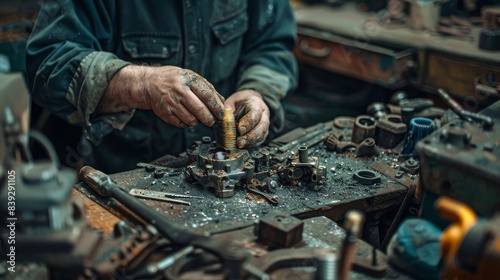 Precision in Progress Skilled Hands Cleaning Mechanical Part on Busy Workbench