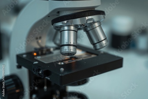 Precision laboratory microscope displaying professional optical system perfect for medical research scientific analysis healthcare education training materials
