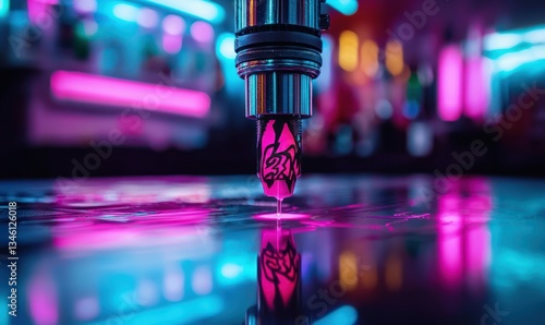 Precision laser cutting machine intricately engraving a design with vibrant neon lights highlighting the process.