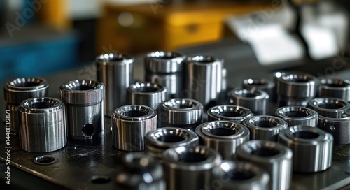 Precision-machined circular metal components on a blue workbench in an industrial workshop.