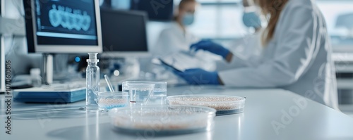 Preclinical Research Lab Focused on Gut Health - Close-Up of Petri Dishes and Scientists Analyzing Microbiome Data in a High-Tech Sterile Environment