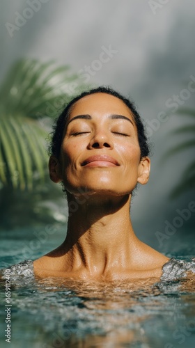 Premium Biohacking Woman Immersed in Tropical Cold Therapy Ice Bath Authentic Holistic Wellness Content for Modern Health and Lifestyle Campaigns
