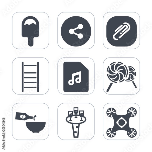 Premium fill icons set on white background . Such as share, liquid, camera, social, sound, sign, paper, wine, melody, drink, fastener, cone, graphic, dinner, alcohol, glass, ice, stick, candy, sweet